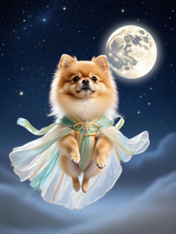 梦幻水彩风,小狗拟人化,身着轻纱,飘浮夜空,满月映衬,超现实童话场景。