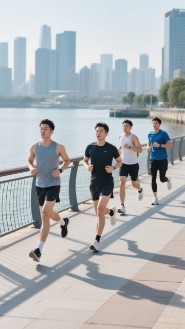 一张充满活力的运动场景照片,展现一位男性运动员在不同运动场景中的动态瞬间。画面采用低角度仰拍,捕捉人物充满力量感的肢体动作和运动姿态。温暖的夕阳从侧后方照射,在人物轮廓边缘形成明亮的金色光晕,同时在地面上投射出长长的影子。天空呈现出清澈的渐变蓝色,点缀着几朵轻盈的白云。人物穿着运动背心和短裤,脚上是专业的运动鞋,肌肉线条在运动中紧绷而富有爆发力。地面根据不同运动场景变化,可能是湿润的柏油跑道、红色的塑胶田径场、绿色的草地或山间小径,表面反射着阳光的光泽。背景可以是城市天际线、郊外的树林或山间的风景,营造出开阔而充满能量的氛围。整体色调以金色、橙色和蓝色为主,高对比度,清晰的细节,展现运动的速度感和力量美,捕捉运动中最具动感和张力的瞬间。
