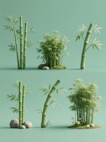 一张纯色背景的海报设计,包含6个完全不同形态的竹林元素系列素材集合,每个竹林元素均保持与原图一致的3D写实风格,拥有清晰的绿色竹节纹理、自然舒展的细长竹叶,光影表现为柔和均匀的环境光,无明显阴影,整体构图规整排布。每个竹林元素在形态上各具特色:有的是几株高大挺拔的竹子,竹叶向上生长;有的是一丛低矮丛生的幼竹,枝叶茂密;有的竹子微微倾斜,呈现出被风吹过的动态感;有的则是单株粗壮的竹子,竹节分明;有的竹林搭配了几块圆润的石头;还有的竹林中点缀着几朵淡雅的小花。所有元素在纯色背景上整齐排列,形成统一且富有变化的视觉效果,具有清晰的视觉层级和高效的信息传达效率,设计风格简洁大方,适合作为装饰或设计素材使用。