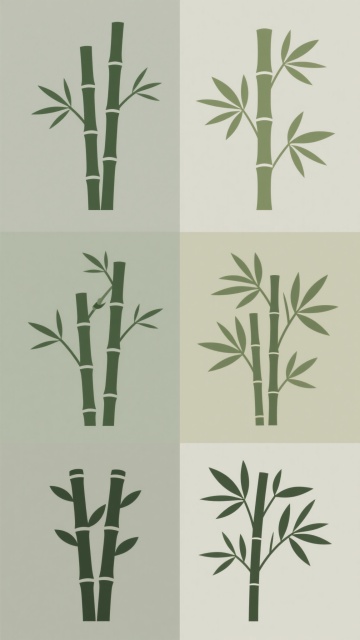 一套六个不同造型的绿色竹子图案,每个图案都保持了简约、扁平的设计风格,采用纯色背景,整体色彩统一为绿色系,竹子的形态各异但元素内容保持一致,六个图案规整地排布在一起,形成一个系列素材集合,视觉上简洁明了,具有良好的整体性和系列感。