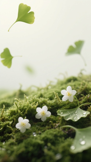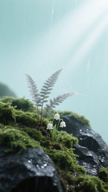 超写实摄影风格,俯视角微距镜头下的晨雾弥漫古老森林地表,画面以清新柔和的浅绿色渐变背景为主,营造宁静自然的氛围。前景是覆盖着绒毯般鲜绿苔藓的地面,苔藓呈现出细腻的纹理和饱满的质感,其间点缀着半透明的蕨类嫩芽和三朵顶戴珍珠晨露的白色小蘑菇,中央位置一块布满深绿苔藓的不规则灰黑色岩石被细密的银灰色菌丝网络温柔托举,岩石表面镶嵌着几粒折射彩虹光晕的露珠,边缘略显粗糙,整体形态自然质朴。构图采用近景特写,主体明确,景深控制得当,背景是逐渐虚化的深绿蕨类植物墙,空气中悬浮着肉眼可见的微小水汽颗粒,光线柔和均匀,从上方树冠缝隙中投下柔和晨光,在苔藓和岩石表面形成斑驳的金色光斑与微妙的光影变化,高光处露珠闪闪发光,阴影部分自然柔和,整体色调是多层次翡翠绿与苔藓灰的和谐交融,传达出清新、静谧、充满生机的自然之美。