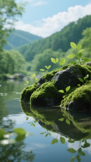 湿润的苔藓覆盖着起伏的地面,中央放置一块表面光滑的圆形青石,周围点缀着带有露珠的蕨类和小型绿色植物,背景是柔和渐变的浅绿色,整体呈现出清晨森林中宁静自然的氛围,光线柔和地洒在苔藓和植物上,营造出清新湿润的感觉。