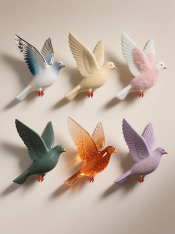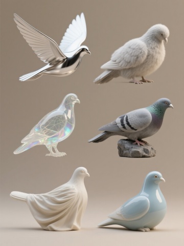 一套6个不同造型的鸽子系列素材集合,每个鸽子采用完全不同的材质,规整排布在纯色背景上。鸽子造型包括:1. 展翅飞翔的流线型鸽子,采用光滑的金属材质,呈现出银白色的光泽和细腻的金属质感;2. 低头梳理羽毛的鸽子,采用柔软的绒毛材质,羽毛蓬松,呈现出浅灰色,带有温暖的色调;3. 站立姿态的鸽子,采用透明的玻璃材质,身体通透,内部有精致的纹路,折射出淡淡的彩色光芒;4. 俯冲姿态的鸽子,采用坚硬的岩石材质,表面粗糙,呈现出深灰色,带有自然的纹理和质感;5. 盘旋姿态的鸽子,采用轻盈的布料材质,表面有褶皱,呈现出米白色,带有柔和的垂坠感;6. 休憩姿态的鸽子,采用光滑的陶瓷材质,表面细腻,呈现出淡蓝色,带有温润的光泽。整体设计风格统一,每个鸽子造型独特,材质鲜明,适合作为系列素材使用。