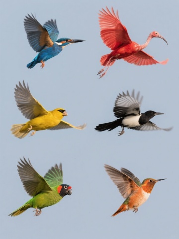 纯白背景上,以超写实摄影风格、清晰锐利的细节、自然柔和的光线和精确的阴影效果,规整排布六只不同品种的飞鸟。每只鸟均展现飞行中翅膀完全展开的动态姿态,羽毛纹理细腻可见,爪子细节清晰。品种及对应颜色分别为:1. 蓝色金刚鹦鹉,亮蓝色羽毛配黄色眼周;2. 红衣主教鸟,鲜红色身体配黑色面部和羽冠;3. 绿孔雀,翠绿色羽毛带金属光泽眼状斑纹;4. 金色雉鸡,金黄色颈羽配彩色尾屏;5. 紫蓝金刚鹦鹉,靛蓝色全身羽毛配黄色眼圈;6. 彩虹吸蜜鹦鹉,多色渐变羽毛(红、绿、蓝、黄相间)。整体构图对称平衡,每只鸟间距均匀,保持一致的高分辨率摄影质感和自然生动的神态。