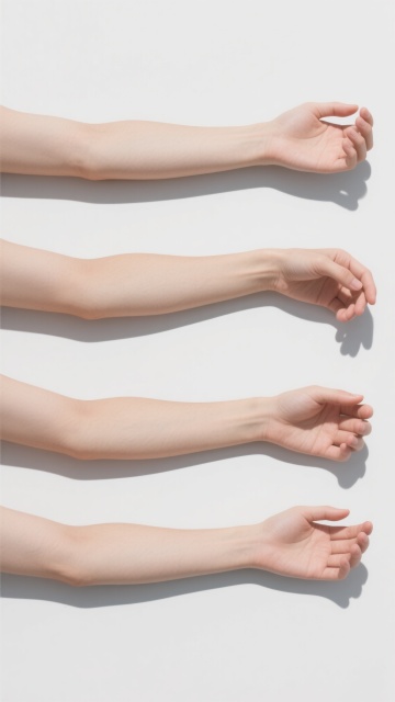 一只女性的手,手臂自然延伸,手掌朝向前方,五指并拢伸直,指尖微微上扬,呈现出优雅的指示手势。手部皮肤白皙细腻,纹理清晰可见,指甲修剪整齐,涂抹着淡粉色的指甲油,带有自然的光泽感。整体画面采用纯白色背景,光线柔和均匀,从上方偏前方照射,在手背和指关节处形成轻微的高光,手腕处有自然的阴影过渡,突出手部的立体感和真实质感,整体风格为高清写实,细节精致,营造出干净、优雅、专业的氛围。