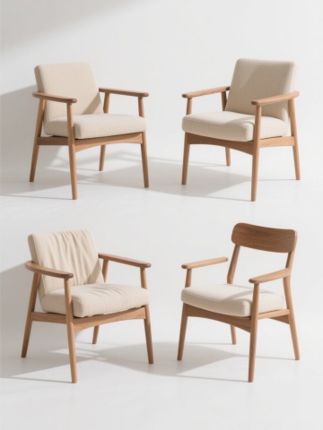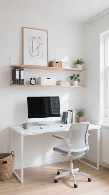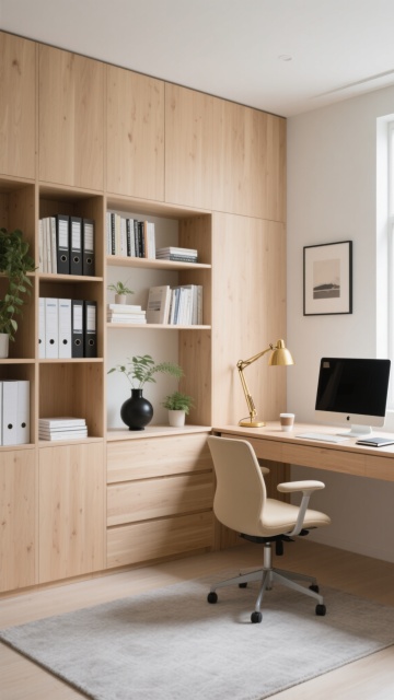 极简主义风格的书桌场景,浅木色整体定制书柜与书桌,开放式与封闭式柜体结合,内置整齐排列的书籍、文件夹和黑色花瓶,书桌配备黄铜色金属支架台灯、黑色屏幕电脑和米色人体工学椅,柔和自然光从右侧窗户洒入,营造温暖明亮的办公学习氛围,地面铺浅灰色地毯,空间布局简洁有序,线条流畅,色调统一为原木色与米色,光影柔和自然,不同场景包括书柜摆放绿植、书桌增加笔记本与咖啡杯、墙面悬挂简约装饰画的布置,保持整体极简现代的设计感。
