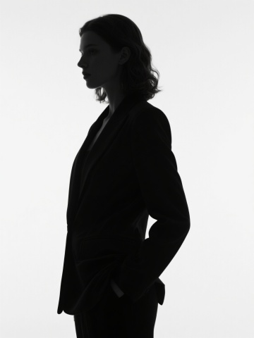 极简风格人物剪影,纯黑色女性侧影,中长发微卷轮廓,身着合体西装外套,双手插兜站姿,肩部线条柔和,整体轮廓简洁流畅,背景为纯白色无任何装饰,高对比度,边缘清晰锐利,无多余细节。