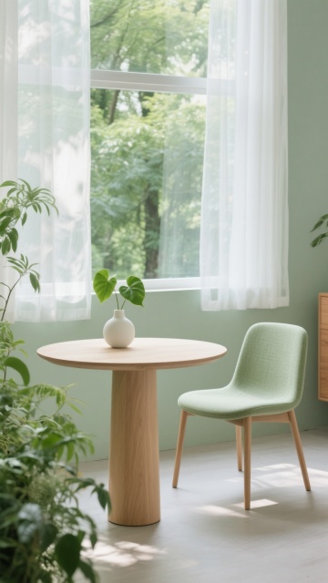 明亮通透的现代简约风格室内场景,柔和的自然光透过半透明白色纱帘洒入,浅木色圆形餐桌搭配同色系圆柱形桌腿,旁边是一把浅绿色布艺餐椅,桌面摆放着白色陶瓷花瓶,里面插着几片鲜活的绿色叶子,窗边和前景有茂盛的绿植增添生机,背景是窗外郁郁葱葱的绿色树木,墙面为淡雅的浅绿色,整体色调清新自然,光影柔和,营造出宁静舒适、贴近自然的氛围,具有简洁的线条和温馨的居家感。