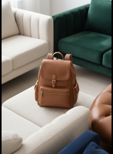 简约现代风格,棕色背包置于柔软沙发之上,营造舒适温馨氛围。