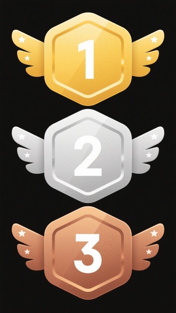 三个垂直排列的六边形徽章,从上到下依次标有数字1、2、3,每个徽章两侧各有一对翅膀,徽章边框上有五角星装饰,整体为卡通风格,色彩鲜艳,上为金色、中为银色、下为铜色,保持原有的布局和色彩,将材质改为磨砂金属质感,表面带有细腻的磨砂纹理,反光柔和不刺眼,立体感强,翅膀部分呈现出轻盈的磨砂金属薄片效果,数字为磨砂金属本色且略微突出于徽章表面,背景为纯白色。