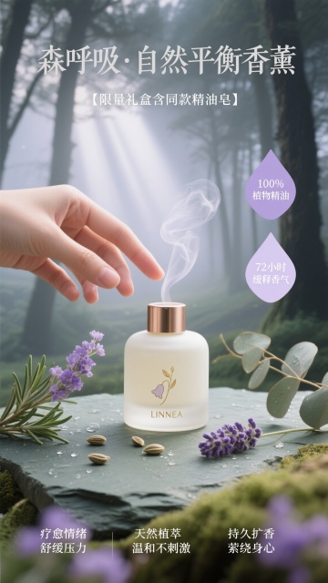 特写镜头,晨露未晞的青石板上,一只纤细的女性手指正轻触一支磨砂质感的陶瓷香薰瓶,瓶身呈现柔和的象牙白,金属盖头是哑光玫瑰金,瓶口萦绕着一缕淡紫色的袅袅烟雾,宛如清晨的薄雾。瓶身正面烫金小字"LINNEA"与手绘铃兰图案相映成趣,瓶底散布着三粒饱满的薰衣草籽。周围是带着露水的迷迭香枝条、浅紫色勿忘我和几片卷曲的尤加利叶,背景是朦胧的晨雾森林,光线从树冠间隙斜射而下形成丁达尔光束,空气中悬浮着细小的香氛分子。海报上方是银灰色手写体标题"森呼吸·自然平衡香薰",下方为"【限量礼盒含同款精油皂】",右侧两个水滴形标签分别标注"100%植物精油"和"72小时缓释香气",底部三行短语采用纤细衬线体:"疗愈情绪 舒缓压力"、"天然植萃 温和不刺激"、"持久扩香 萦绕身心"。整体色调以象牙白为基底,搭配薰衣草紫与橄榄绿的渐变,营造出静谧治愈的森林系氛围。