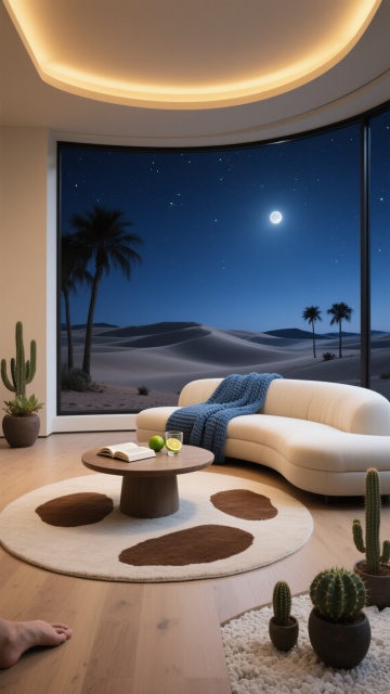 低角度仰拍,极简主义客厅被深邃的靛蓝色黄昏笼罩,磨砂玻璃移门过滤出靛青与紫罗兰交织的暮色,原L形沙发现为深炭灰色丝绒材质,两个不规则几何黄铜边靠垫在暗光中泛着冷金属光泽,相连的茶几变为悬浮式黑色大理石台面,下方垂挂着三盏微型玻璃钟乳石吊灯。浅灰色地毯升级为带有细微银色几何图案的羊毛材质,人字形木地板在阴影中呈现深棕与乌木色的渐变。沙发背景墙变为哑光黑色,中央悬挂着一幅悬浮式LED光影装置,金色线条随时间缓慢流动变幻形态。右侧角落的绿植现为一株大型琴叶榕,栽于六边形哑光黑水泥花盆中,叶片边缘在暮色中泛着蓝绿色荧光。天花板中央是一个直径两米的圆形智能调光装置,此刻正投射出类似月食的渐变光晕,空间整体呈现出一种冷静克制的未来感,却依然保留着家的温度与静谧。
