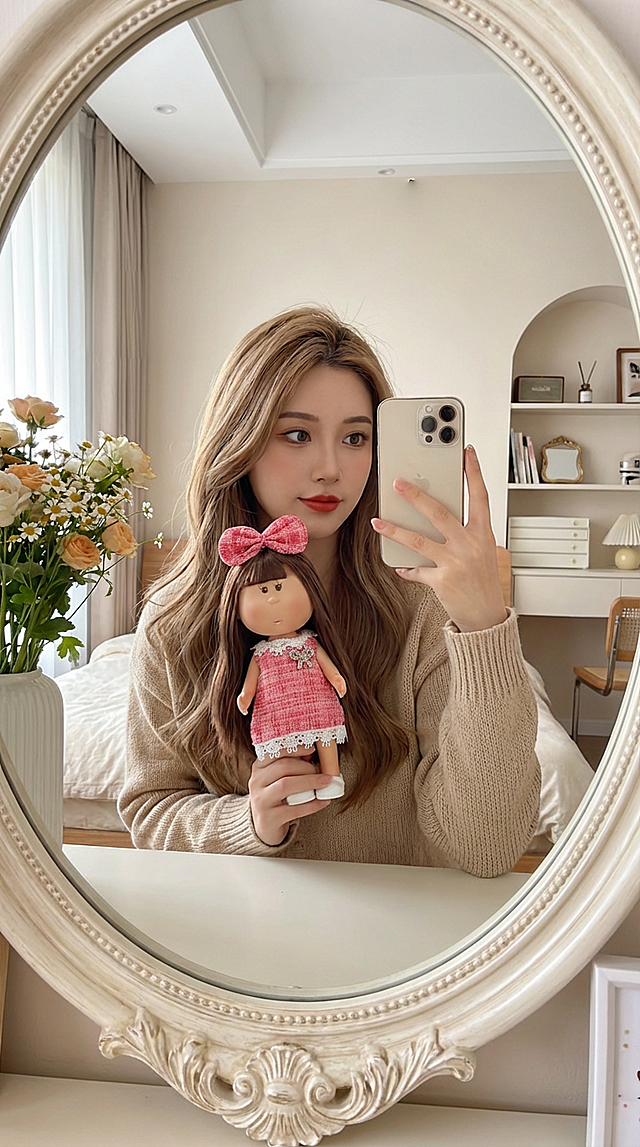 图中的娃娃高度在24cm,需要生成奶茶发色美女,拿着娃娃,对镜子自拍的照片。要求9:16,画质高清,手中娃娃清晰,人物只露出上半身,美女风格可以多元化,比如御姐,辣妹,甜妹等,适合小红书平台种草娃娃产品的照片,生成不同的10张照片。详情