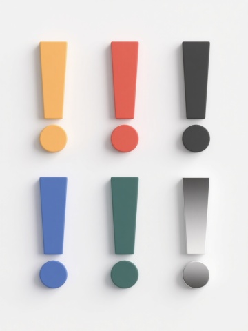 六个不同配色、不同样式、不同材质的问号造型,采用卡通风格,每个问号均有黑色描边和立体光影效果,浅色背景,上下两行对齐排列,保持统一的卡通艺术风格、简洁的构图布局和明快的氛围。