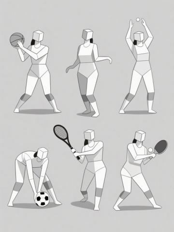 一张纯色白色背景的人物动态参考图,画面中以规整的网格状排布着8个不同完全动作的女性人体素体,每个素体均采用简洁流畅的淡灰色线条绘制,线条粗细均匀、边缘平滑,部分素体带有淡灰色块面阴影以增强体积感,展现出动感的姿态,包括站立、挥手、抬臂、叉腰、转身等日常与动态姿势,人物结构采用Q版卡通风格,头部较大呈椭圆形,身体比例为3头身左右,关节处有明显的立方体块状结构提示,整体画面干净整洁,仅有线条和少量阴影构成的人物形态,无任何多余细节和文字,视觉层级清晰,信息传达直接,适合作为绘画动态参考素材使用。