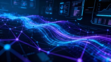 赛博朋克风格的金融数据可视化场景,深蓝色与霓虹粉为主色调,光线呈现科技感十足的蓝色光源与粉色高光交织,具有强烈的光影对比和细腻的阴影细节,前景是由蓝色网格线和动态波动的红色柱状图表构成的数据界面,图表线条流畅且带有发光效果,背景为深邃的宇宙星空,点缀着闪烁的星辰和星云,营造出神秘而充满未来感的氛围,整体画面采用近景聚焦数据图表、远景虚化星空的景深控制,呈现出清晰的视觉层级,科技感十足的数字艺术风格,强调数据流动的动态美感与宇宙空间的广阔深邃,信息传达高效且符合科技与金融融合的主题。