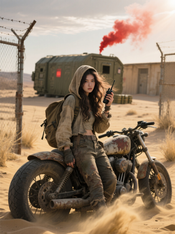 废土世界的机械术士:身穿拼接改造的深褐色防水油布长袍,戴着巨大、带有护目镜和天线装置的金属框架宽檐帽,提着一个布满铆钉和管线的金属工具箱,站在锈迹斑斑的钢铁高架废土站台残破屋檐下。背景是喷着刺鼻黄色或绿色蒸汽/废气的巨大、生锈的改装“蒸汽”火车头(更像机械怪兽),拉着几节暗血红色、布满涂鸦的铁皮车厢。一只安装了机械义眼的改装小猫头鹰(羽毛凌乱)蹲在他肩部的护甲上。工业朋克美学,高饱和与低饱和对比,霓虹灯光污染,废土滤镜。