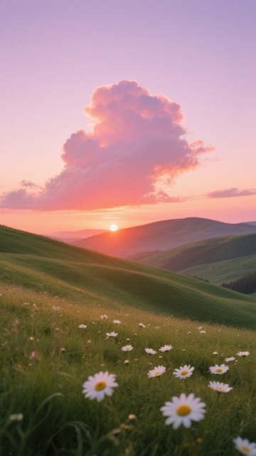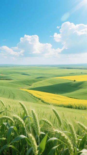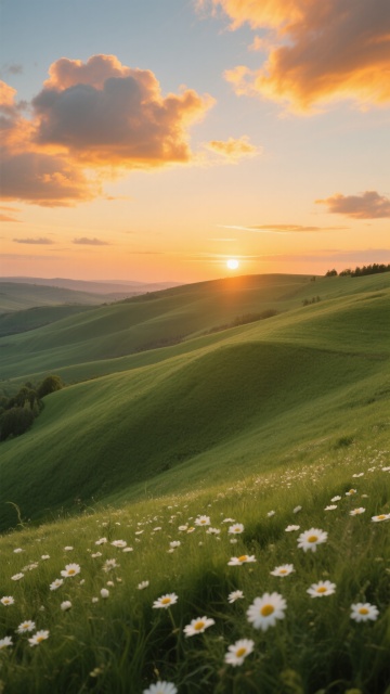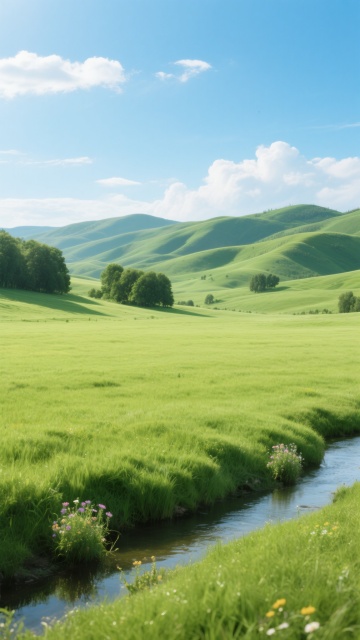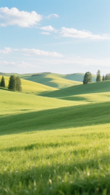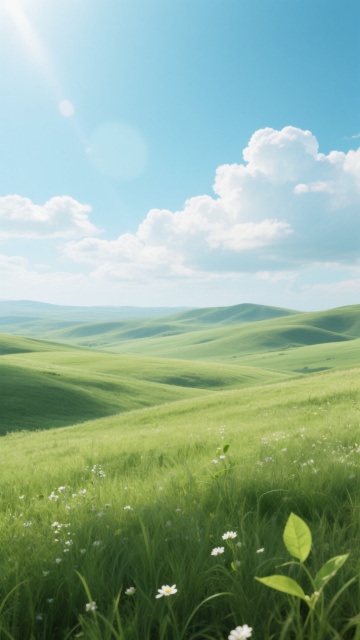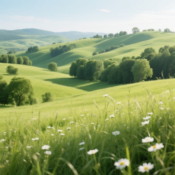 高清摄影风格,明亮通透的光线,温暖的自然光从画面左上方照射,强烈的明暗对比,清晰的阴影细节,浅米色粗糙质感的天然石材台面占据前景,表面有自然的纹理和细微凹凸,海面被替换为广阔无垠的绿色草原,草原上点缀着零星白色野花,远处是连绵起伏的淡蓝色丘陵,天空保持纯净的浅蓝色,飘着少量白色积云,整体色调清新自然,营造宁静开阔的氛围,画面边缘有轻微的光晕效果,突出石材的质感和草原的层次感。