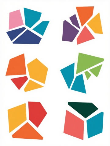 六个不同配色、不同样式、不同材质的不规则有机形态色块,在纯白色背景上以整齐的网格状排列,每个色块色彩鲜明且各不相同,样式包含光滑纯色、磨砂质感、细微纹理、渐变过渡等多种表面处理效果,整体构图简洁、现代、富有设计感,画面干净利落,无任何文字、LOGO、二维码及其他装饰元素。