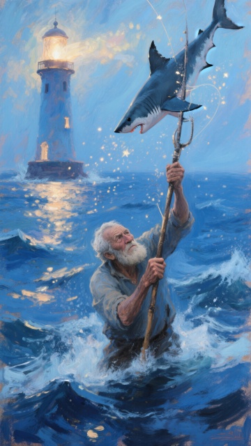 画面中心是发光的灯塔,下方波涛汹涌的海里,一个老人手里将鱼叉举起,正与鲨鱼搏斗,紧张的气氛让人深陷其中,深蓝色背景,传达著名书籍海明威《老人与海》中老人不肯认输的精神