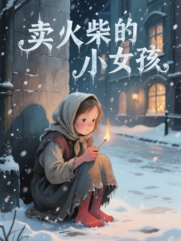 安徒生童话绘本风格, 细腻水彩质感, 柔和怀旧色调, 略带忧伤的唯美, 聚焦人物情感, 富有表现力的光影, 北欧冬日氛围, 19世纪欧洲街景。画面构想: 大雪纷飞的寒冷夜晚,小女孩蜷缩在昏暗街角的墙根下,手中紧紧攥着一把火柴。她赤着冻红的双脚,破旧的头巾裹着头发,眼神充满无助和渴望。背景是模糊的、灯火通明的富人家窗户,形成强烈对比。标题字体设计融入冰晶或微弱的火焰元素。