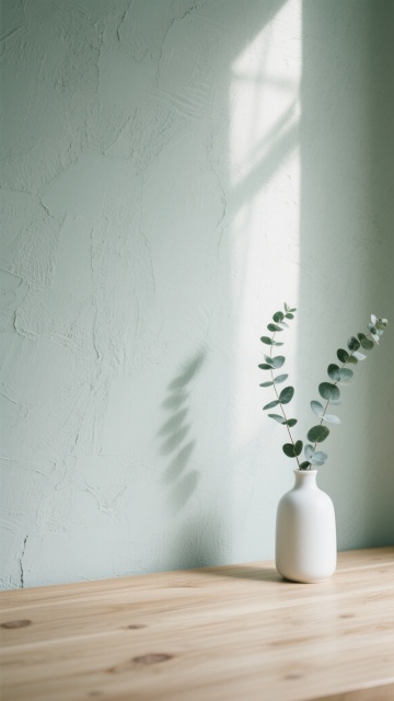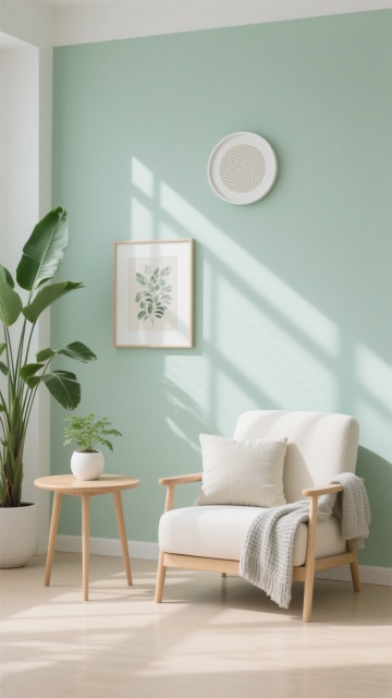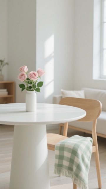明亮通透的室内场景,自然光透过轻薄的白色纱帘洒入,柔和照亮空间,浅木色圆形餐桌搭配同色系木质桌腿,旁边是一把浅绿色的软垫餐椅,桌面摆放着简约的白色陶瓷花瓶,里面插着几片鲜活的绿色枝叶,窗外是郁郁葱葱的绿树,室内墙面为清爽的浅绿色,整体风格简约自然、温馨舒适,充满生机与宁静感,光影层次丰富,细节清晰,色调柔和统一,营造出放松惬意的居家氛围。