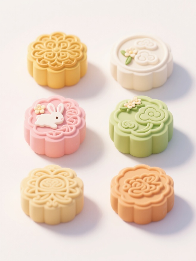 可爱卡通风格,6个不同样式、不同材质、不同配色的月饼整齐排列在白色背景上,月饼表面有精致的传统花纹,部分月饼带有立体浮雕效果,色彩包括经典的金黄色、奶白色、粉色、绿色等,搭配简约的月饼相关元素如小巧的桂花、玉兔剪影、祥云图案,整体色调明快柔和,光影呈现柔和的立体效果,边缘有轻微的渐变晕染,充满节日氛围与温馨感。