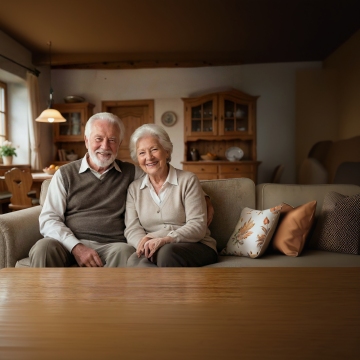温暖柔和的晨光透过木质窗棂洒入室内,照亮了一对老年夫妇的背影,老先生穿着浅色衬衫,戴着眼镜,左手轻轻搭在身旁穿着碎花上衣的老太太肩上,两人依偎着望向窗外,窗外可见翠绿的树枝,室内窗台上摆放着古朴的陶瓷茶壶、茶杯和一盆红色花卉,整体画面呈现出温馨、宁静、岁月静好的氛围,光影层次丰富,色调温暖偏黄,具有高度写实的质感和细腻的细节刻画。
