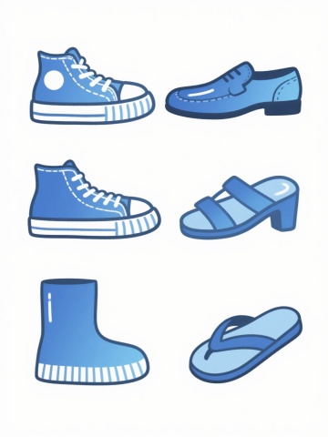 一组六个完全不同的时尚鞋类单品的规整排布集合,采用简约扁平风格,以均匀的线条勾勒轮廓,搭配低饱和度的马卡龙色系填充,每个鞋款都有清晰的结构细节和微妙的明暗过渡,白色纯色背景,整体呈现出清新、可爱且统一的视觉效果,包括系带运动鞋、高帮帆布鞋、坡跟凉鞋、切尔西靴、厚底老爹鞋和尖头高跟鞋,所有鞋款均保持相同的绘画技法和视觉语言,整齐排列形成系列感。