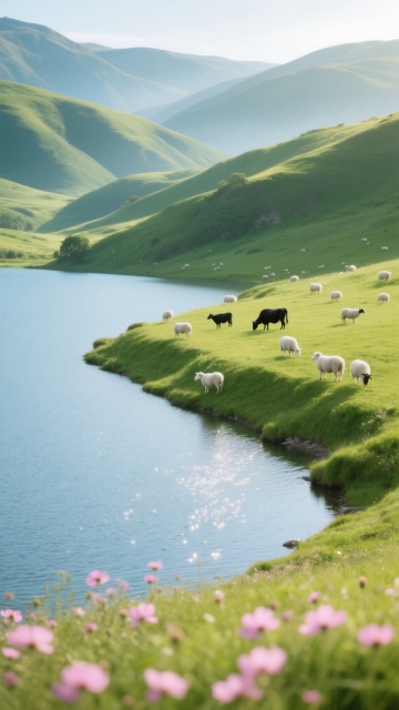 一幅宁静致远的自然风景摄影作品,晨光熹微中,广阔的山谷间弥漫着轻盈的白色晨雾,雾霭在墨绿色的茂密松树林间流动,远处连绵的青山被柔和的光线勾勒出起伏的轮廓,近处是一片生机盎然的嫩绿色草地,一只白色的绵羊独自在前景的草地上安静觅食,整体色调以苍翠的绿色、柔和的晨光色与朦胧的白色为主,光影层次丰富,画面通透,营造出清新、静谧、远离尘嚣的田园诗意氛围,构图采用经典的三分法,前景草地、中景松林与远景山峦形成清晰的空间层次,景深控制恰到好处,细节丰富,质感细腻。