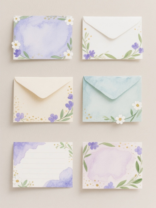 水彩风格,浅色背景,六个不同配色、不同样式、不同材质的信纸造型,上下两行对齐排列,信纸边缘装饰有淡雅的蓝紫色和白色小花、绿色枝叶以及金色斑点,整体呈现出清新自然、柔和宁静的氛围,具有细腻的水彩晕染质感和轻盈通透的视觉效果。