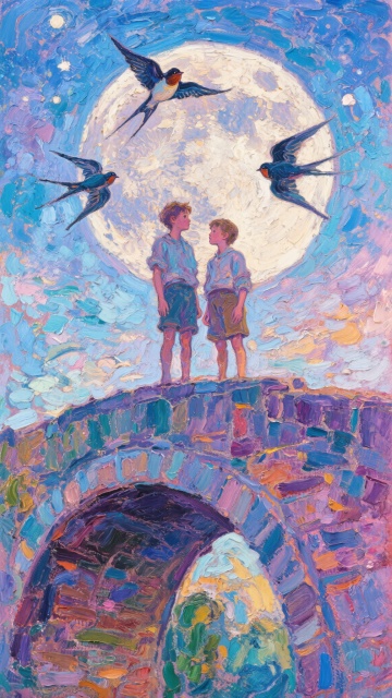 印象派风格油画,以深蓝与紫罗兰色交织的夜空为背景,点缀着明亮的星点和一轮弯月,下方是被柔和蓝绿色灯光照亮的欧式小镇,尖顶房屋错落有致,房前小径上一对身着复古服饰的情侣依偎漫步,路旁点缀着紫色和粉色的花卉,整体色调神秘而浪漫,笔触厚重而富有肌理感,光影对比柔和,营造出宁静梦幻的夜晚氛围。