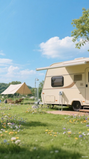 阳光透过茂密的绿色树叶洒下斑驳光影,在开阔的绿色草地上,布置着一个米色帆布帐篷和一个带遮阳棚的露营帐篷,帐篷周围摆放着原木色折叠桌椅,桌上铺着格纹餐布,旁边散落着几个彩色靠垫和一本翻开的书,整体呈现出自然、宁静、舒适的户外露营氛围,高清晰度,写实风格,温暖色调,柔和光线,丰富的细节纹理。