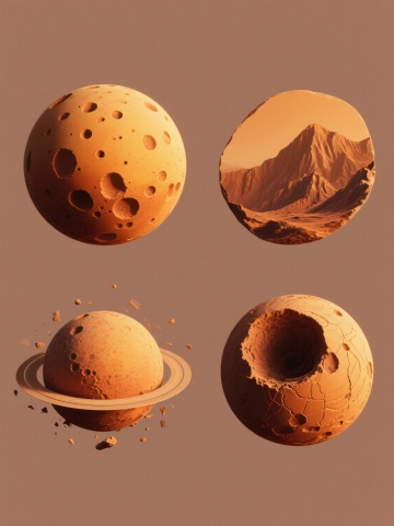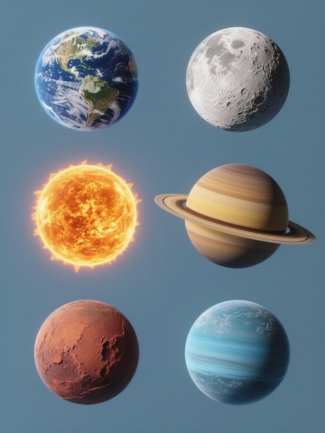 一组6个相同造型的卡通风格行星图标集合,每个行星都有带白色条纹的环形轨道、表面点缀着白色星星和橙色小星星,周围环绕着彩色小星球和流星线条,整体呈圆形构图,行星位于中心位置,所有图标在纯色背景上规整排列成2行3列的网格布局。第一个行星采用光滑玻璃材质,呈现深邃的蓝色渐变,环形轨道为半透明紫蓝色,背景为纯白色;第二个行星为哑光金属质感,整体呈银灰色,环形轨道为磨砂金属灰并带有白色高光条纹,背景为浅灰色;第三个行星是木质纹理材质,行星表面为温暖的棕黄色木纹,环形轨道为深棕色并保留白色条纹,背景为米白色;第四个行星为霓虹灯发光材质,行星主体为亮粉色渐变并带有发光边缘,环形轨道为亮蓝色发光效果,白色条纹部分发光更强,背景为深紫色;第五个行星是毛绒材质,整体呈柔和的浅绿色,表面有绒毛质感,环形轨道为浅粉色毛绒材质,白色条纹为白色绒毛,背景为淡蓝色;第六个行星为水晶材质,呈现清澈的紫色透明感,内部有细微的水晶纹路,环形轨道为透明蓝色水晶并带有白色条纹,背景为淡黄色。所有图标保持完全一致的元素内容和造型结构,仅在材质表现和整体色彩上形成鲜明对比,每个图标独立在各自的纯色背景中,整体设计风格统一为可爱卡通,视觉效果和谐且富有系列感。