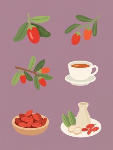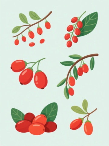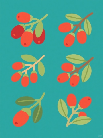 一组六个不同中药材元素的系列插画集合,保持与原图一致的平面卡通插画风格,每个元素均以独立的白色背景呈现,规整排布。元素包括:1. 红色枸杞果实与绿色枝叶的组合,形态自然下垂;2. 棕色饱满的桂圆果实,带少量枝干;3. 深绿色卷曲的茶叶叶片,边缘有自然波浪;4. 橙黄色的干菊花,花瓣呈放射状排列;5. 紫红色的桑葚果实,成串生长;6. 棕褐色的干红枣,带有纵向纹理。所有元素均采用相同的明亮色彩、平滑线条和简洁造型,确保整体视觉风格统一,无任何文字或装饰元素。