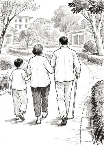 两位白发老人并肩散步的背影,老爷爷穿着深色短袖上衣和浅色长裤,左手牵着一条大型浅色犬的牵引绳,老奶奶穿着浅色长袖上衣和同色系长裤,右手轻轻搭在老爷爷的左臂上,他们走在一条铺着石板的小路上,小路两旁是茂密的绿色树木和低矮的灌木丛,阳光透过树叶洒下斑驳的光影,营造出温馨、宁静、岁月静好的氛围,画面色彩明亮柔和,光影层次丰富,具有清晰的写实摄影质感,背景为自然公园场景。