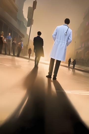 两位穿着白色医生制服、佩戴听诊器的医生,双臂交叉站立在医院走廊中,背景为明亮模糊的医院环境,采用极简主义风格,扁平化设计,低饱和度色调,线条简洁流畅,几何色块构成,无渐变光影,清晰的轮廓线,简约的构图,注重空间感和物体形态的纯粹表达,整体画面干净利落,传达专业、冷静、有序的医疗氛围。