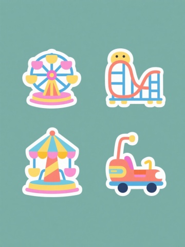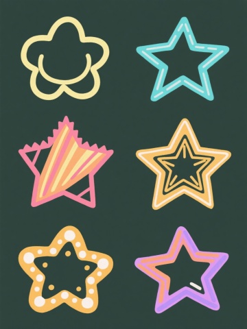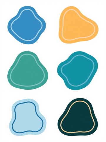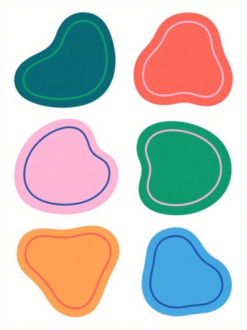 6个具有不同配色、不同样式、不同材质的图形造型,每个图形拥有独特形状,整体以浅色为背景,呈上下两行对齐排列;采用扁平设计风格,轮廓线条圆润流畅,色彩鲜明饱满且具有手绘感的涂抹质感,图形边缘带有轻微的高光白边,营造出简洁明快、充满童趣的视觉氛围,构图平衡对称,所有图形元素大小均匀分布,信息传达直接清晰。