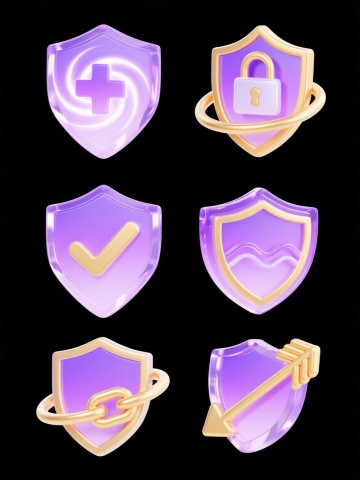 六个益生菌元素系列图标,保持3D立体风格,纯色背景,每个图标都有蓝色盾牌轮廓,内部包含不同的益生菌形态,第一个是蓝色螺旋形益生菌配橙色颗粒,第二个是蓝色球形益生菌群配黄色光点,第三个是蓝色棒状益生菌链配橙色圆点,第四个是蓝色分叉形益生菌配黄色颗粒,第五个是蓝色波浪形益生菌配橙色光斑,第六个是蓝色环形益生菌配黄色光点,所有图标规整排布,保持统一的蓝色调与透明质感,水滴效果点缀其中,整体视觉风格协调一致。