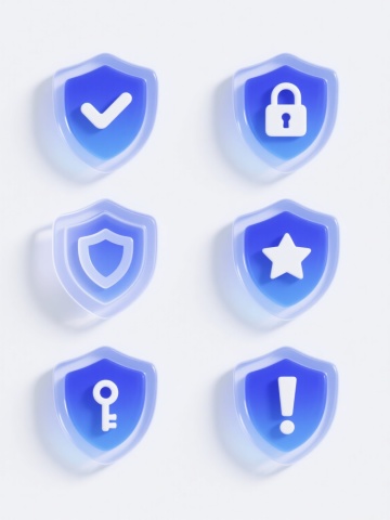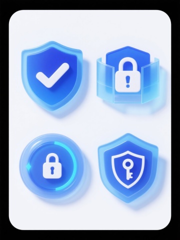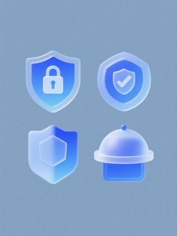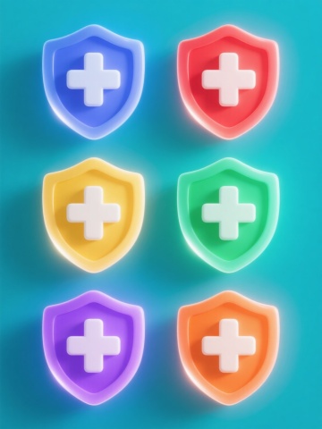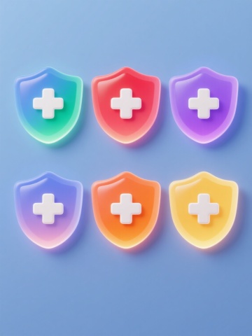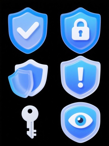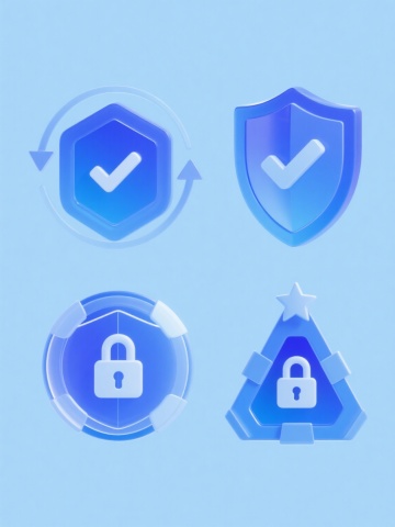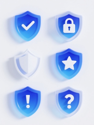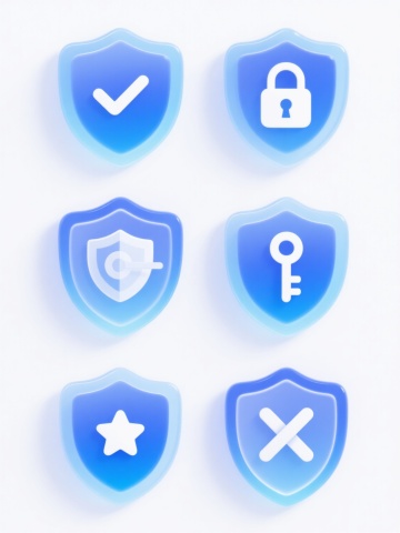 一组六个规整排布的益生菌系列素材集合,每个元素均采用相同的3D立体图标风格,纯净的纯色背景,整体色调以清新明亮的蓝色为主,搭配活力橙黄色点缀。每个图标都具有光滑圆润的边缘、半透明渐变的质感和细腻的高光阴影效果,呈现出通透的玻璃态材质感。第一个图标是蓝色盾牌内包裹着白色螺旋状益生菌和橙色菌球;第二个图标是蓝色胶囊造型,内部可见橙色益生菌菌群和流动的透明液体;第三个图标是蓝色圆形培养皿,里面有多个橙色益生菌球体和白色菌群链条;第四个图标是蓝色水滴形状,内部包含橙色菌球和白色波浪状菌群结构;第五个图标是蓝色六边形蜂窝结构,每个蜂窝格内都有不同形态的橙色益生菌和白色菌群;第六个图标是蓝色试管造型,管内装有透明液体,漂浮着橙色益生菌球体和白色螺旋状菌群。所有图标均保持一致的光影处理,边缘有一圈深蓝色描边,内部有细小的气泡细节,整体风格统一、清新、科技感十足,突出益生菌的健康、活性和保护特性。