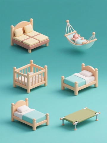 一套6个完全不同元素内容的睡眠主题3D卡通风格系列素材集合,规整排布于纯白色纯色背景上,整体保持圆润可爱的Q版C4D渲染风格,温暖明亮的色彩搭配,柔和均匀的光影效果,细腻光滑的材质表现,每个元素都有俏皮的小细节和精致的高光处理。元素1:一个戴着紫色星星睡帽的小女孩蜷缩在黄色弯月上熟睡,周围环绕着粉色星球和黄色星星;元素2:一只穿着条纹睡衣的卡通小熊抱着枕头躺在云朵形状的床上,床头有小夜灯和故事书;元素3:一个蓝色的睡眠图标,由闭着的眼睛和弯曲的睡眠曲线组成,周围点缀着小星星和Z符号;元素4:一张铺着柔软粉色床单的双人床,床上有两个枕头和一个毛绒玩具,床头柜上有一杯温牛奶和一个闹钟;元素5:一个漂浮的睡眠舱,里面有一个宇航员穿着睡衣在零重力环境下安睡,舱外有星星和行星;元素6:一对穿着睡衣的卡通情侣背靠背躺在床上,男士打着小呼噜冒出Z字,女士抱着一个月亮形状的抱枕。所有元素大小统一,排布整齐,形成和谐统一的系列感。