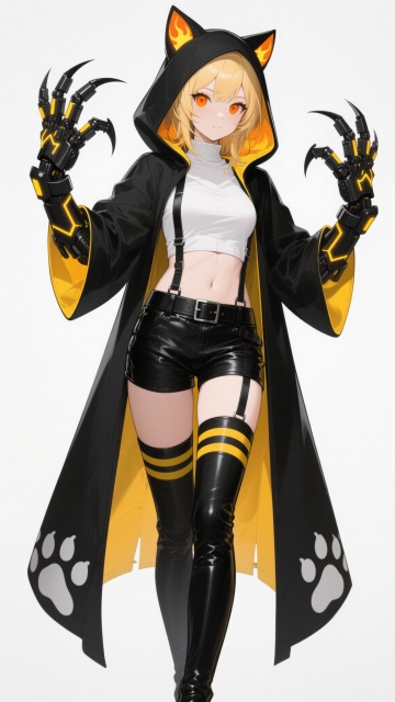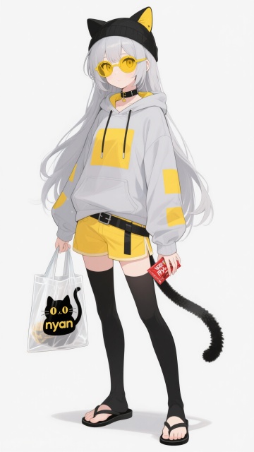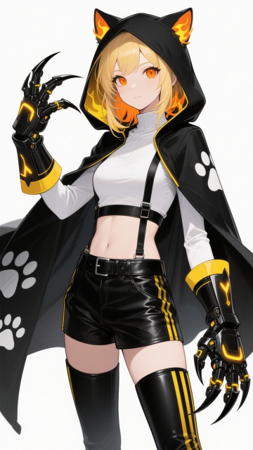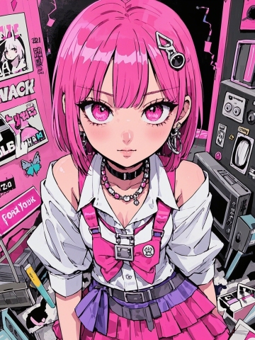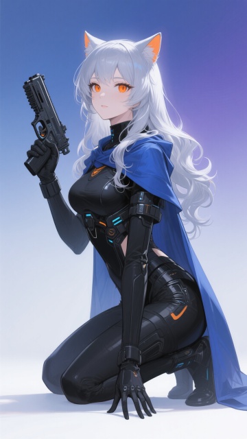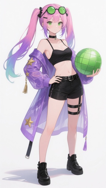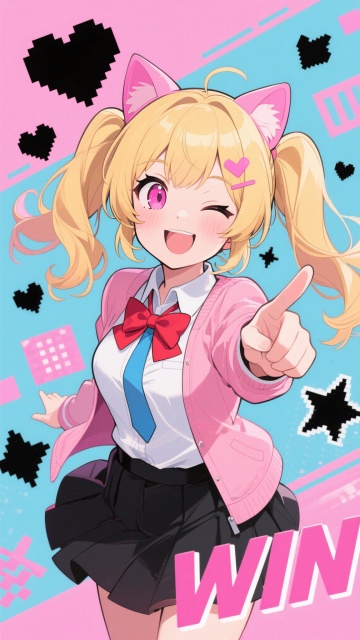 日系二次元动漫风格,一位蓝发紫瞳的少女,头戴黑色猫耳贝雷帽,身穿深蓝色背带短裙,内搭白色蕾丝花边衬衫,脚踩黑色厚底马丁靴,佩戴银色五角星项链和黑色皮质手套,肩上挎着一个印有星星图案的粉色斜挎包,左手比出剪刀手,右手自然下垂,身体微微侧向一边,表情俏皮可爱,整体造型时尚靓丽,色彩以蓝黑为主色调,搭配白色和粉色点缀,纯黑色背景,线条流畅,色彩鲜明,细节丰富,充满青春活力。