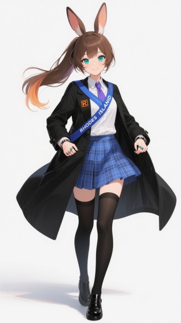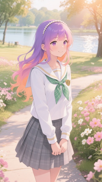 日系动漫风格插画,画面整体采用暖橙色与淡紫色渐变为主色调,柔和的午后阳光从侧上方照射,形成明亮的高光和细腻的阴影,光线通透感强,空气感十足。前景中,一位身着白色镶金边水手服外套、灰色格纹百褶裙的少女,她有着一头及腰的渐变粉紫色长卷发,发尾微微内扣,头顶戴着一个带有珍珠装饰的发箍,刘海呈自然的空气感波浪状。少女正侧身站立,双手自然交叠放在身前,身体微微前倾,面带温柔的微笑,双眼是清澈的橙紫色渐变眼眸,眼神明亮有神。她的绿色格纹领巾系成蝴蝶结状,胸前别着一个金色徽章。背景是开满粉色和白色花朵的公园小径,远处有波光粼粼的湖面和朦胧的绿色树木,整体构图采用三分法,少女位于画面中央偏左位置,背景元素层次分明,营造出温馨浪漫的氛围,画面细节丰富,线条流畅,色彩过渡自然,具有强烈的插画艺术感和视觉吸引力。