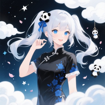 日系二次元动漫风格少女插画,以天蓝色和淡紫色为主色调,柔和的光影效果,画面充满梦幻感和透明感。画面中央是一位银发双马尾少女,她有着蓝色渐变的眼瞳,眼尾微微上扬,此刻正歪着头,嘴角带着俏皮的微笑,一只手托着脸颊,另一只手拿着一个带有星星图案的魔法棒,魔法棒顶端闪烁着微光。少女穿着带有蓝色蝴蝶结和蕾丝花边的黑色连衣裙,袖口和裙摆处有白色绒毛装饰。她的头发上系着蓝色丝带,发间点缀着小巧的星星发饰。背景是淡蓝色的天空,漂浮着白色的云朵和闪烁的星星,周围环绕着几只可爱的白色小幽灵,它们有着黑色的眼睛和微笑的嘴巴,正围绕着少女飞舞。整体构图采用中心聚焦式,少女位于画面中央,背景元素分布均匀,营造出一种欢快、灵动的氛围。