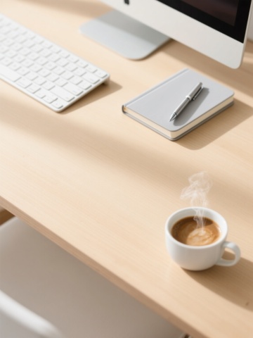自然光从窗户斜射而入,在浅色墙壁上投下清晰的窗格阴影,营造出明亮通透、宁静舒适的居家办公氛围。一张原木色桌面的书桌,桌面光滑有自然木纹,桌腿为白色简约设计。桌上放置着不同场景和布置:左侧可能是一盆茂盛的绿色观叶植物,右侧是一台打开的银色笔记本电脑,电脑旁叠放着几本不同厚度的书籍,书籍上点缀着一盆小型多肉植物在白色花盆中;或者桌面上是一盏简约设计的台灯,旁边散落着几本翻开的笔记本和一支金属钢笔,桌角可能还有一个小巧的相框或一个复古风格的时钟;又或者是桌面上整齐排列着绘画工具,几支不同型号的画笔插在陶瓷笔筒中,旁边放着打开的颜料盒和一张铺展开的素描纸,角落点缀着一杯热气腾腾的咖啡杯。整体画面采用写实主义风格,色彩以原木色、白色、绿色为主,光影对比柔和,细节丰富,展现出现代简约而不失温馨的不同书桌场景布置。