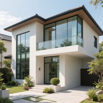 现代简约风格庭院设计,浅灰色木质甲板地面中央摆放着圆形混凝土餐桌,桌上有一盘水果,两侧是木质长椅,背景为白色矮墙,墙前种植着多种绿色植物,包括大型观叶植物和低矮灌木,左侧有高大树木,枝叶呈现绿色与橙黄色渐变,右侧有黑色金属框架木质顶棚,地面铺设白色鹅卵石与灰色石板台阶,整体采用自然光线,光影分明,色调以白色、灰色、木色和绿色为主,营造出宁静、舒适、具有高级设计感的户外休闲空间。