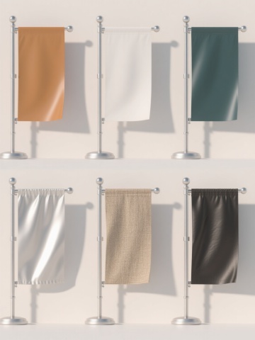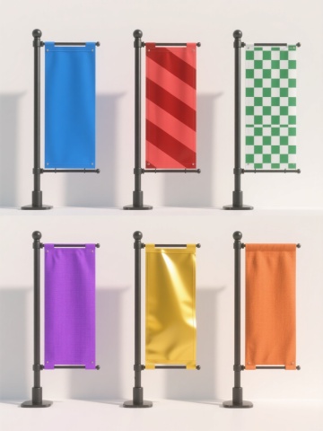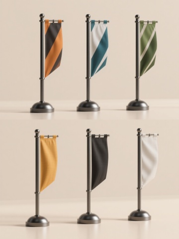 3D渲染风格的道旗设计展示图,浅色背景,上下两行对齐排列共六个道旗造型,每个道旗拥有独特的配色方案、样式设计和材质表现。道旗主体为垂直长方形旗帜,搭配金属质感黑色旗杆和圆形底座,旗杆顶部有小圆球装饰。第一行从左到右分别为:深蓝色哑光布料道旗,旗帜边缘有白色细条纹装饰;橙红色高光缎面道旗,旗帜中央有简约几何图案;浅绿色磨砂塑料质感道旗,四角有圆角处理。第二行从左到右分别为:淡紫色透明亚克力材质道旗,带有细微磨砂纹理;米黄色亚麻布道旗,表面有自然布纹肌理;浅灰色反光金属质感道旗,边缘有抛光处理。整体设计简洁现代,光影柔和,物体边缘清晰,具有产品展示图的专业感和真实质感,无任何文字、LOGO、二维码及电话地址等元素。