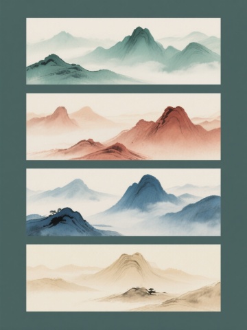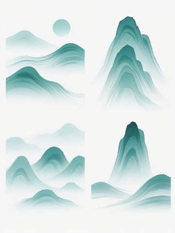 中国传统水墨风格的六把不同造型、不同形状、不同样式的扇子素材集合,每把扇子均保持扇骨与扇面的基本结构,扇面采用淡雅的渐变色彩和流畅的线条勾勒山水云雾图案,融入金色点缀和细腻纹理,整体色彩变换为青蓝、碧绿、赭石、绯红、藤黄、墨黑等不同色调,六把扇子规整排布于纯色背景上,保持数字插画的平滑质感和简洁构图,画面清新雅致,具有传统韵味与现代设计感。