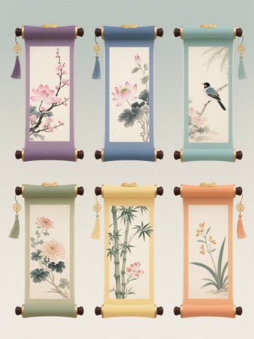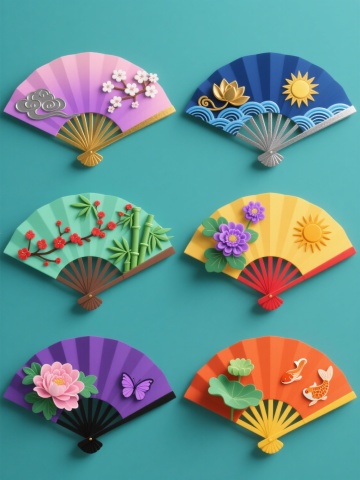 六个不同样式的传统扇子系列素材集合,每个扇子保持扇面内容但具有独特的纯色背景、元素造型和整体色彩,所有扇子规整排布。第一个扇子:粉色背景,扇面为淡紫色渐变,扇骨为金色,装饰有白色樱花和银色祥云图案;第二个扇子:蓝色背景,扇面为深蓝色渐变,扇骨为银色,装饰有金色莲花和蓝色波浪图案;第三个扇子:绿色背景,扇面为浅绿色渐变,扇骨为棕色,装饰有红色梅花和绿色竹叶图案;第四个扇子:黄色背景,扇面为橙黄色渐变,扇骨为红色,装饰有紫色菊花和黄色太阳图案;第五个扇子:紫色背景,扇面为深紫色渐变,扇骨为黑色,装饰有粉色牡丹和紫色蝴蝶图案;第六个扇子:橙色背景,扇面为橙红色渐变,扇骨为黄色,装饰有绿色荷花和橙色鲤鱼图案。所有扇子采用相同的对称构图,保持一致的立体感和装饰风格,整体呈现出和谐统一的视觉效果。