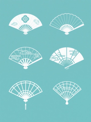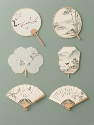 六个不同样式的中国传统扇子系列素材集合,规整排布在纯色背景上,每个扇子保持传统扇面结构但造型各异:有的扇骨呈流线型弧度,有的为几何棱角状,有的扇面边缘有波浪纹装饰,有的整体呈椭圆形,有的带有不对称剪裁设计,有的扇骨末端有流苏装饰;色彩上每个扇子整体色调完全不同,包括水墨黑白色调配金色勾边、青绿色渐变配银色花纹、靛蓝色底纹配红色点缀、粉紫色系晕染效果、橙黄色明亮色系、墨绿色复古色调;每个扇面都有不同的传统花纹内容,有的是山水写意画,有的是花鸟工笔画,有的是吉祥云纹图案,有的是书法文字,有的是传统戏曲人物,有的是缠枝莲纹样;所有扇子都具有类似原图的浮雕质感和光泽感,保持平面化设计风格,整体排列整齐有序,形成一个视觉统一又各具特色的系列素材集合。